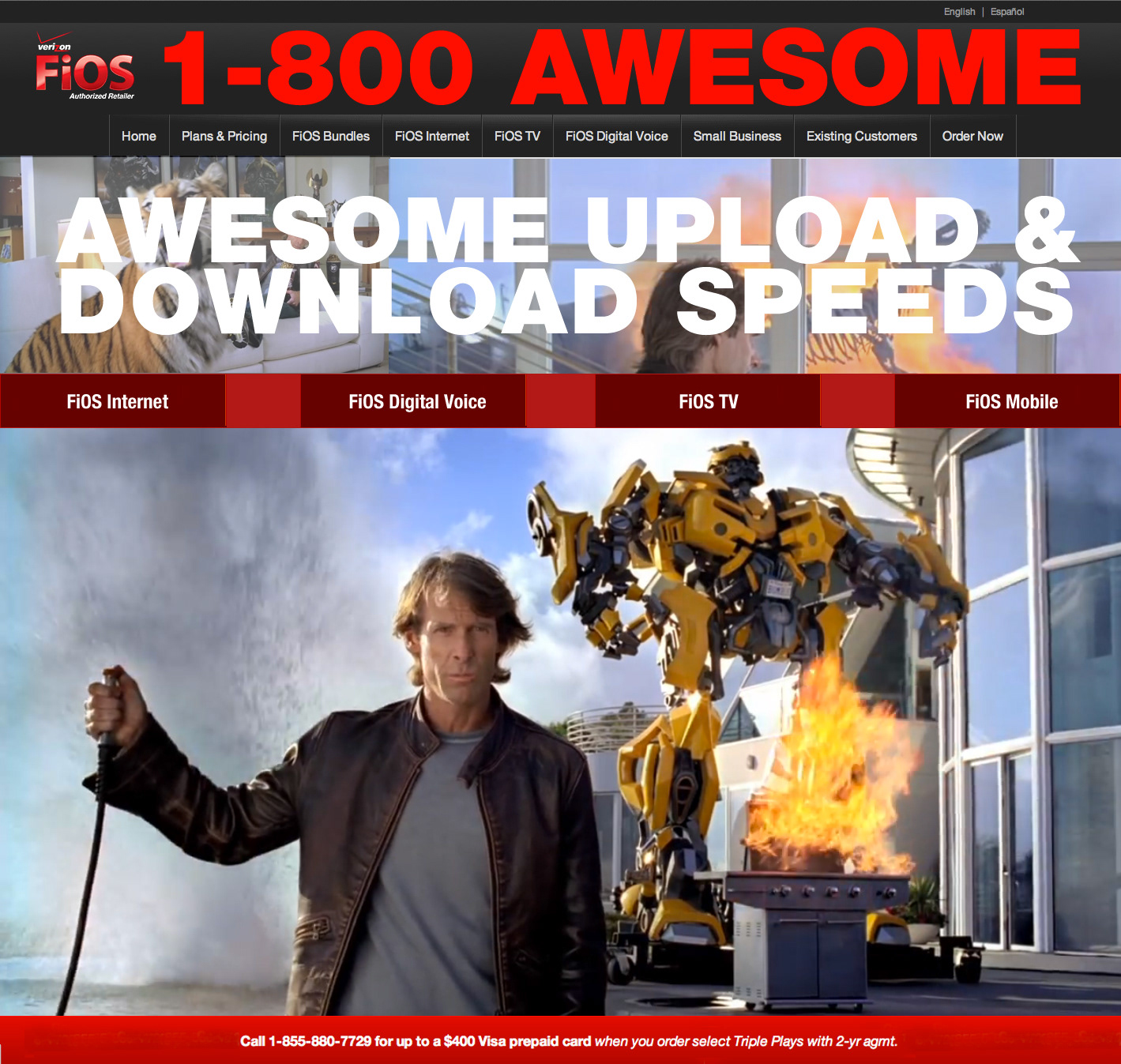 Michael Bay, a Malibu mansion, a tiger, an 18 foot tall transformer and an Oscar winning special effects artist kicked off this Verizon FiOS campaign. Verizon spent over 20 billion dollars on their fiber optics program so that customers could have the fastest internet speeds and the best quality picture and sound on TV. The challenge was how to get new customers? The answer, Go big. It all came down to, Awesome! This campaign created an awesome spike in sales for Verizon FiOS.